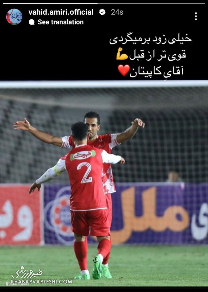 وحید امیری کاپیتان دوم و بازیکن باتجربه سرخپوشان با انتشار یک استوری برای عالیشاه آرزوی سلامتی کرد و نوشت: «خیلی زود برمیگردی قوی تر از قبل. آقای کاپیتان»