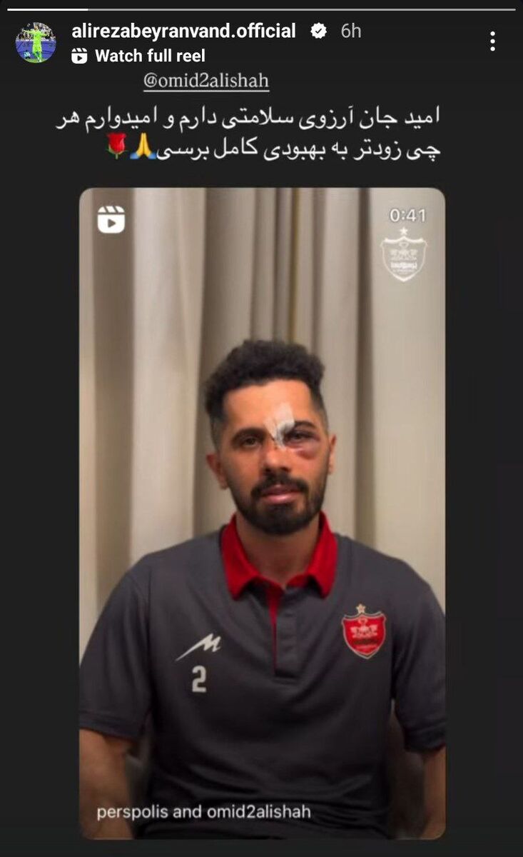 علیرضا بیرانوند پیام ویدیویی امید عالیشاه بعد از مصدومیتش را در استوری اینستاگرام خود قرار داد تا به این شکل برای همبازی سابق خود آرزوی سلامتی داشته باشد.